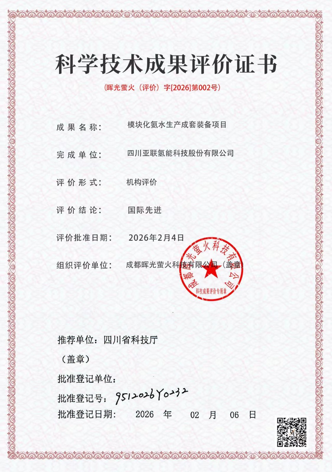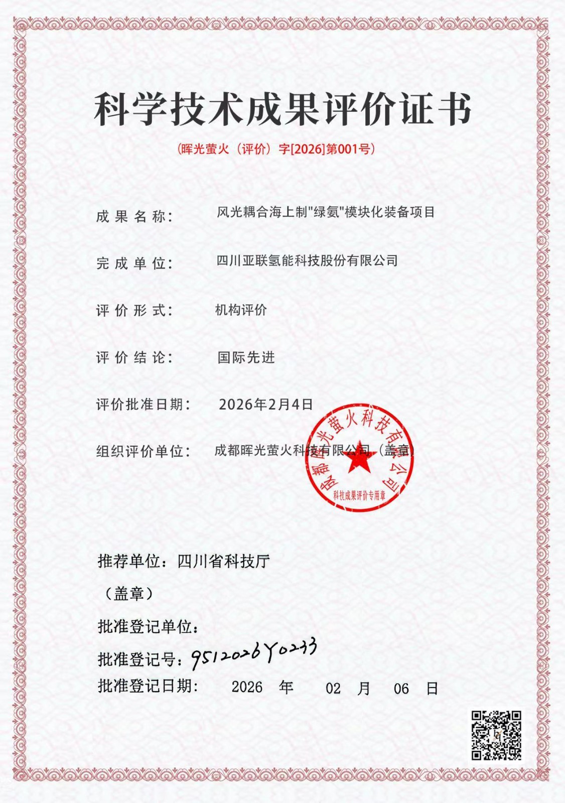 好消息!我公司于2026年申报的两项科技成果评价,“风光耦合海上制绿氨模块化装备项目”和“模块化氨水生产成套装备项目”双双获得四川省科技厅做出的“国际先进”结论!